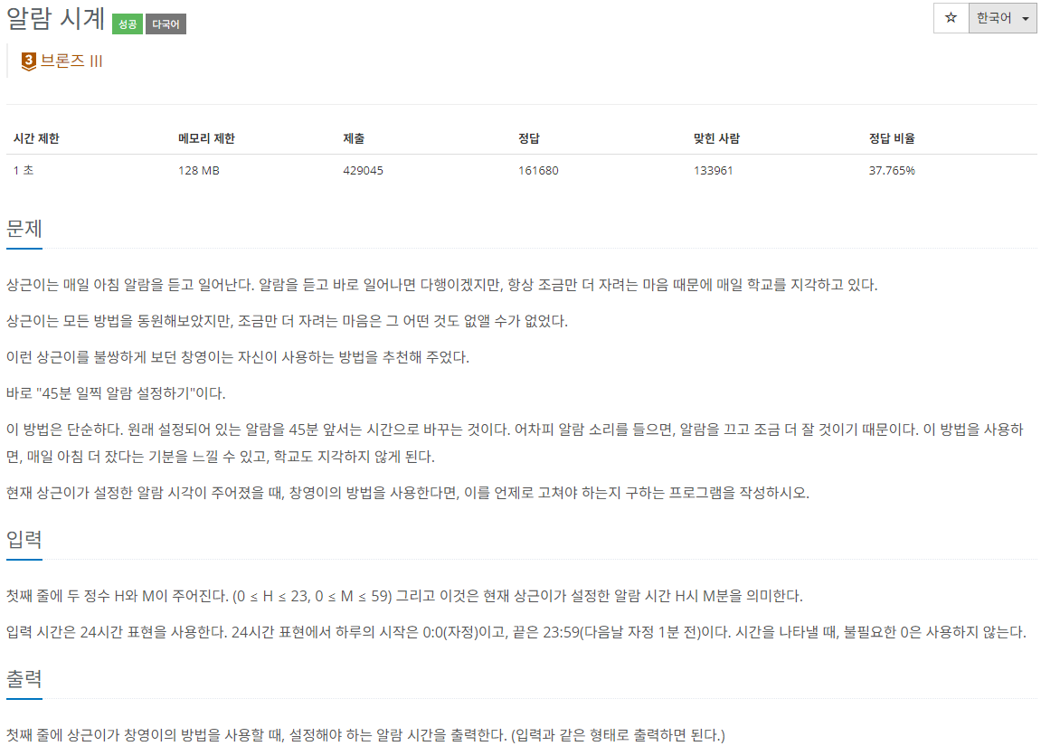 45분을 먼저 빼고 음수가 되는 시간이 있다면 양수로 바꾸어 출력하면 해결할 수 있다.