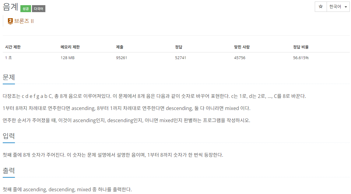 | 11~16 | 조건문을 통해 결과를 출력한다. type[0]==7 이면 숫자들이 모두 오름차순으로 정렬되어 있다는 뜻이므로 "ascending"을 출력하고, type[1]==7 이면 숫자들이 모두 내림차순으로 정렬되어 있다는 뜻이므로 "descending"을 출력한다. 둘 다 아닌 경우 "mixed"를 출력하여 정답을 구한다. |