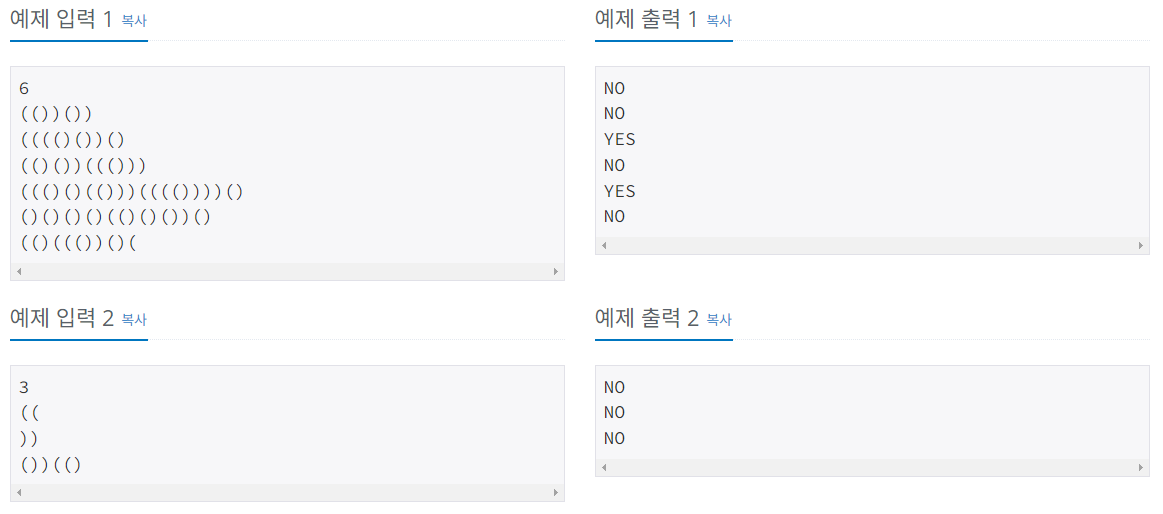 | 13~14 | 반복문 종료 후, N==0 이라면 모든 괄호 문자열이 VPS 상태이므로 "YES"를 출력한다. 아니라면 "NO"를 출력하여 정답을 구한다. |