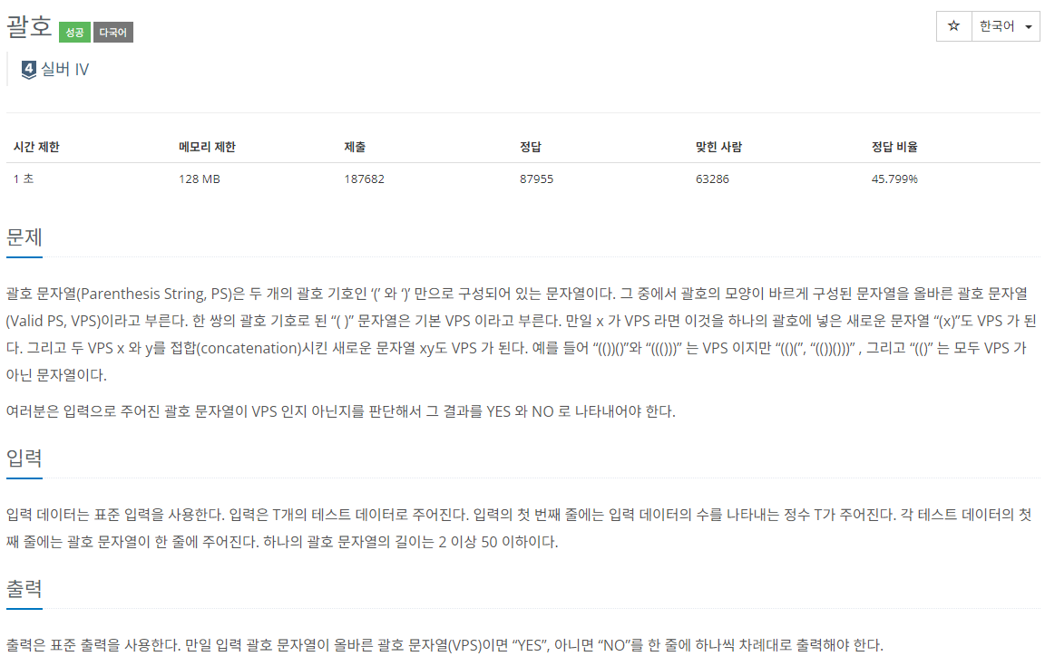 괄호 문자열(Parenthesis String, PS)은 두 개의 괄호 기호인 ‘(’ 와 ‘)’ 만으로 구성되어 있는 문자열이다. 그 중에서 괄호의 모양이 바르게 구성된 문자열을 올바른 괄호 문자열(Valid PS, VPS)이라고