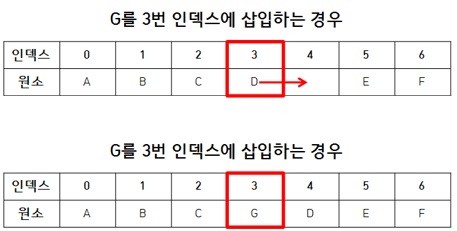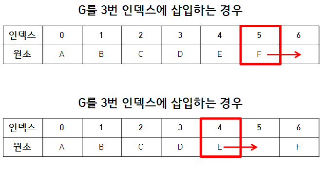 2번 자리에 X라는 사람이 와서 앉아야 한다면, 2번 의자에 앉아 있던 사람부터 그 뒤쪽의 사람들이 모두 한 칸씩 뒤로 밀려나야 한다. (삽입)