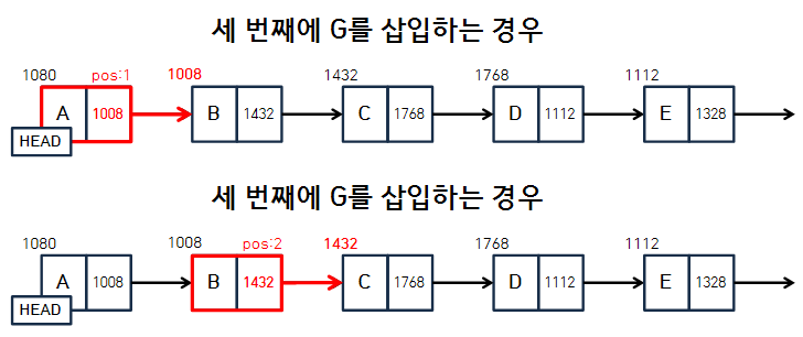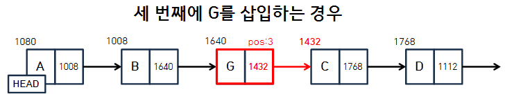 새 노드를 생성한 다음, 원하는 위치의 이전 노드가 새 노드를 가리키게 하고, 새 노드의 링크가 다음 노드를 가리키게 만드는 것으로 구현할 수 있다.