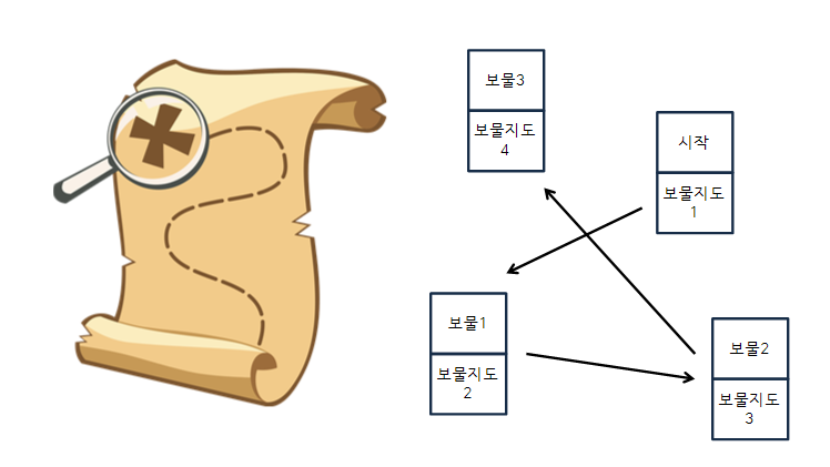 첫 번째 보물의 위치가 있는 보물 지도를 가지고 시작하여, 첫 번째 보물 위치에는 보물(데이터)과 두 번째 보물지도(포인터)가 함께 존재한다. 두 번째 보물 지도를 보고 그다음 보물을 찾으면 역시 보물(데이터)과 그다음 보물지도(포인터)가 존재하여 보물(데이터)을 순서대로 하나씩 찾아가는 것이다. (탐색)