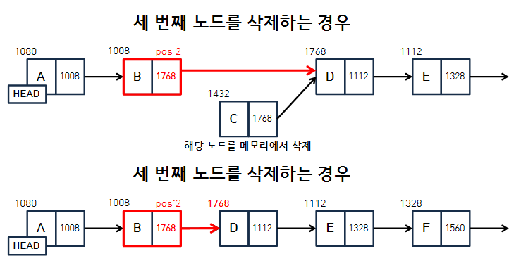 삽입과 비슷한 방법으로 삭제하려는 노드의 바로 이전 노드의 링크를 다음 노드를 가리키게 한다.