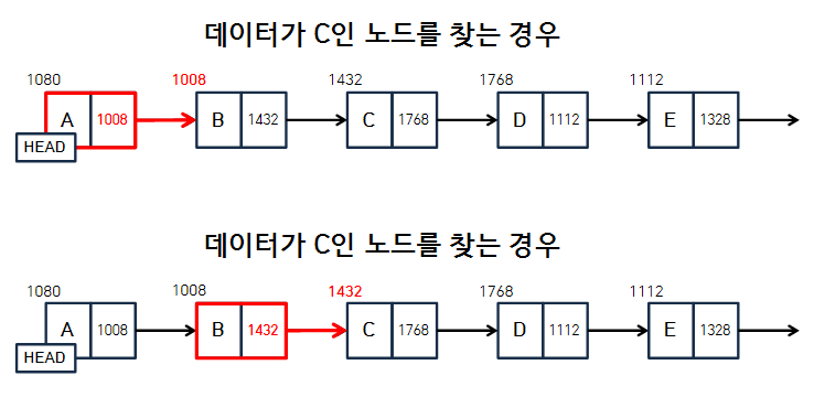 따라서 원하는 데이터 값을 찾기 위해서는 헤드부터 시작하여 링크를 통해 노드를 하나씩 거쳐가며 값을 찾아야 한다.