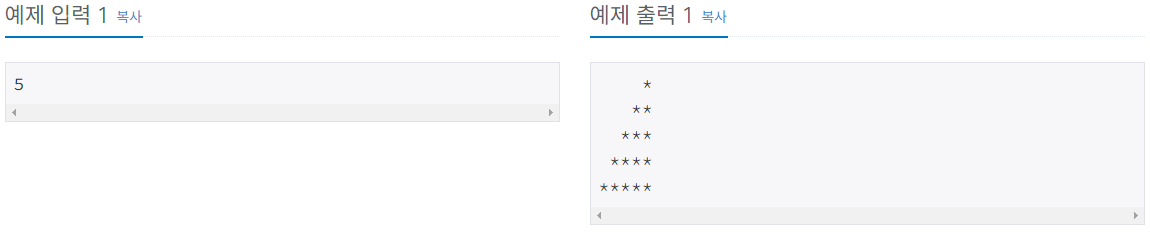 예제 출력을 통해 우측 끝으로 정렬된 *을 1개, 2개, 3개,... N개까지 출력하는 문제이다.